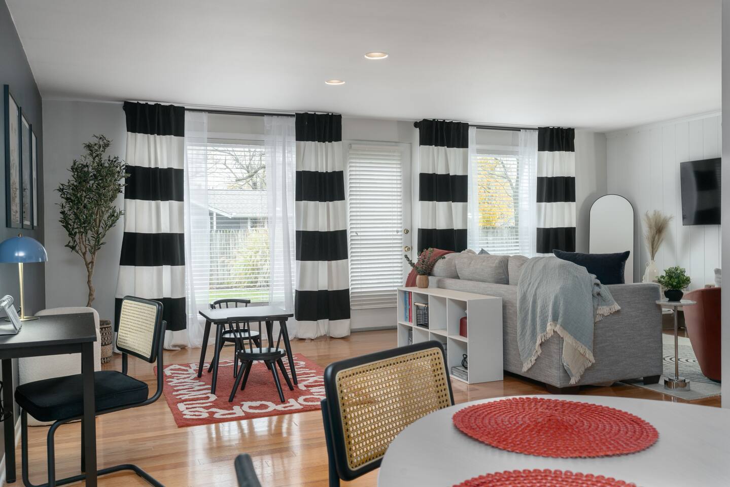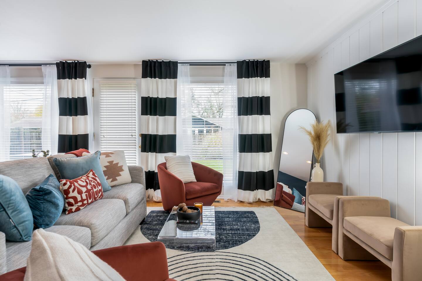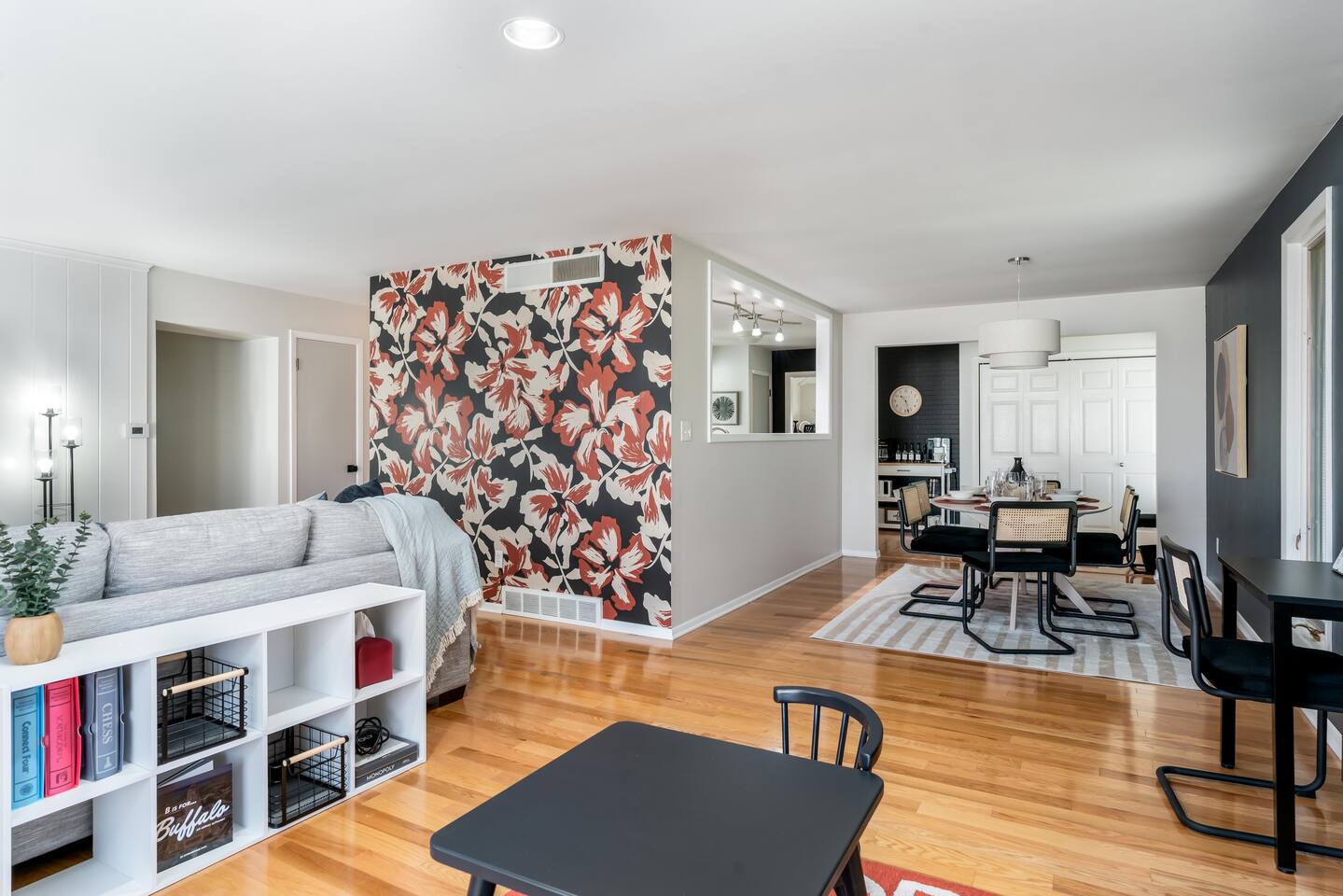 Have fun with the whole family at this stylish residential ranch! + 2 spacious communal living spaces each with a SMART TV + Fully equipped kitchen with brand new everything + 1 King, 2 Queens, 1 Twin + Pool table + Kids play nook + Coffee bar that rivals the local coffee shops + Private workstation + First floor washer and dryer + Shower tub combo, and separate shower stall Centrally located in Amherst, NY, and minutes to the nearest highway, grocery stores, restaurants and more.